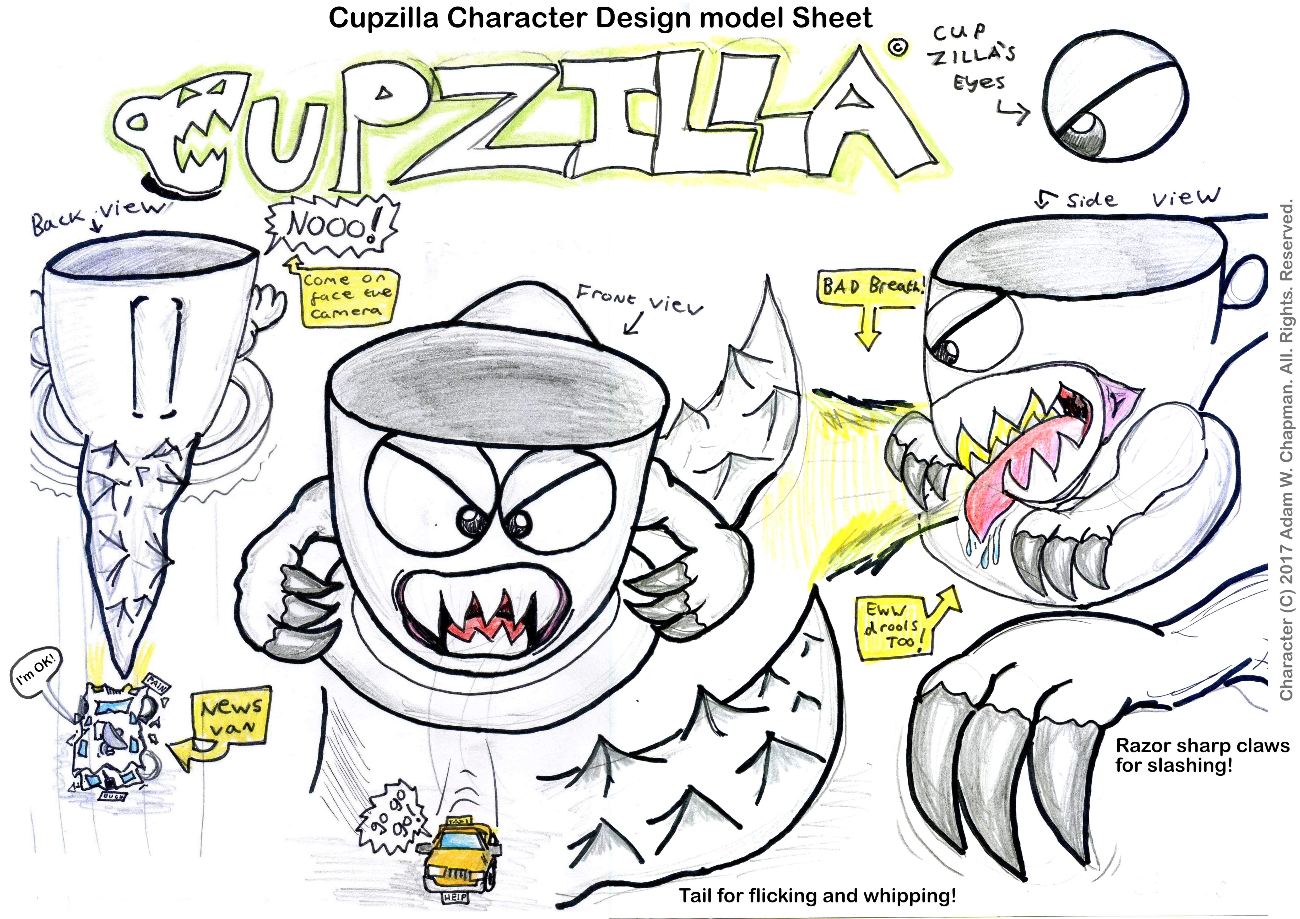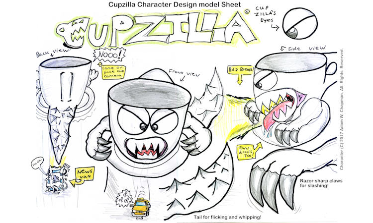 Allready being a fan of Godzilla, I wanted to create something that was unique, both funny and recognizable. I collaborated on a Stopmotion project where I was the director and part time modeler. This is the first character design sheet, created of Cupzilla.