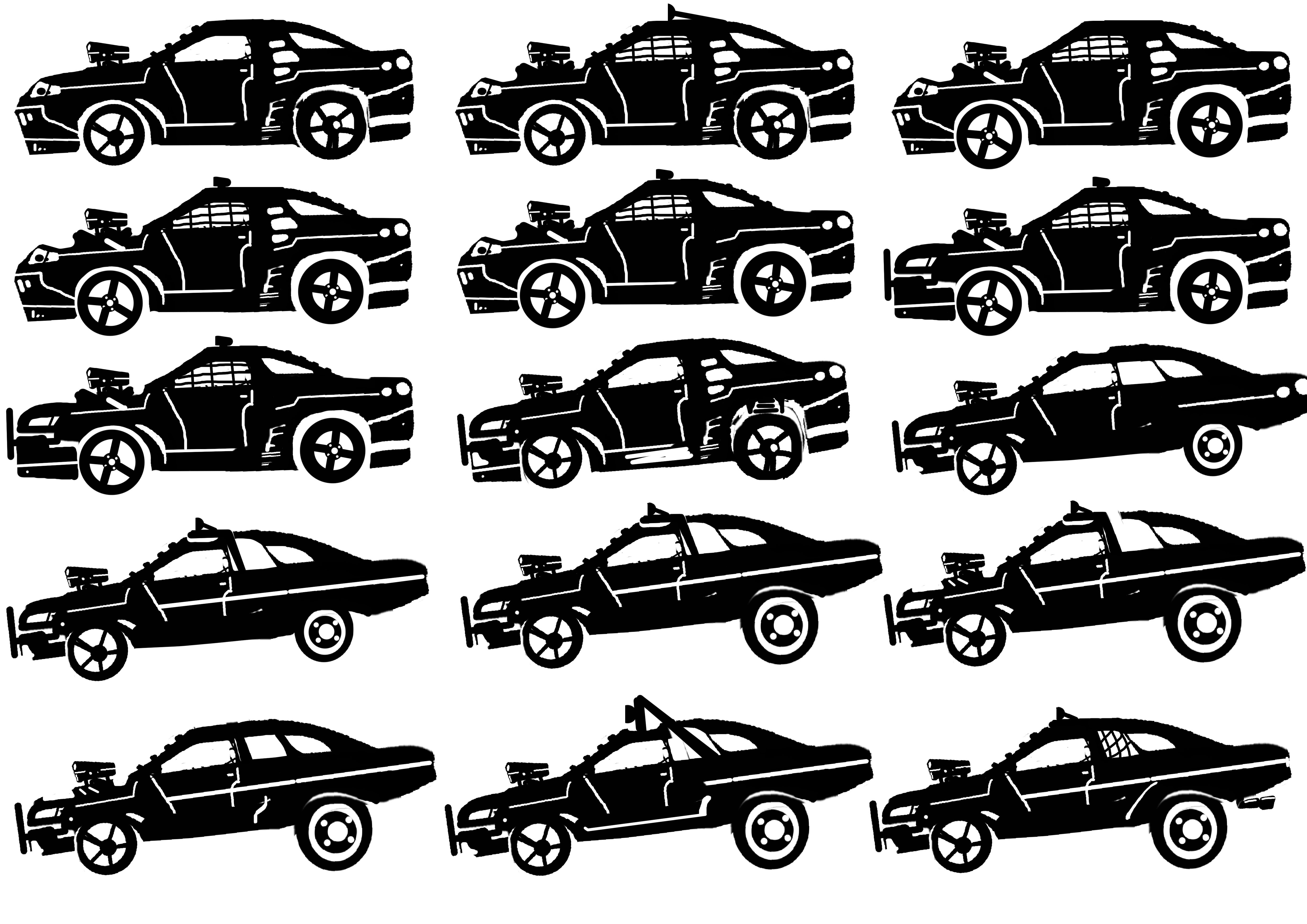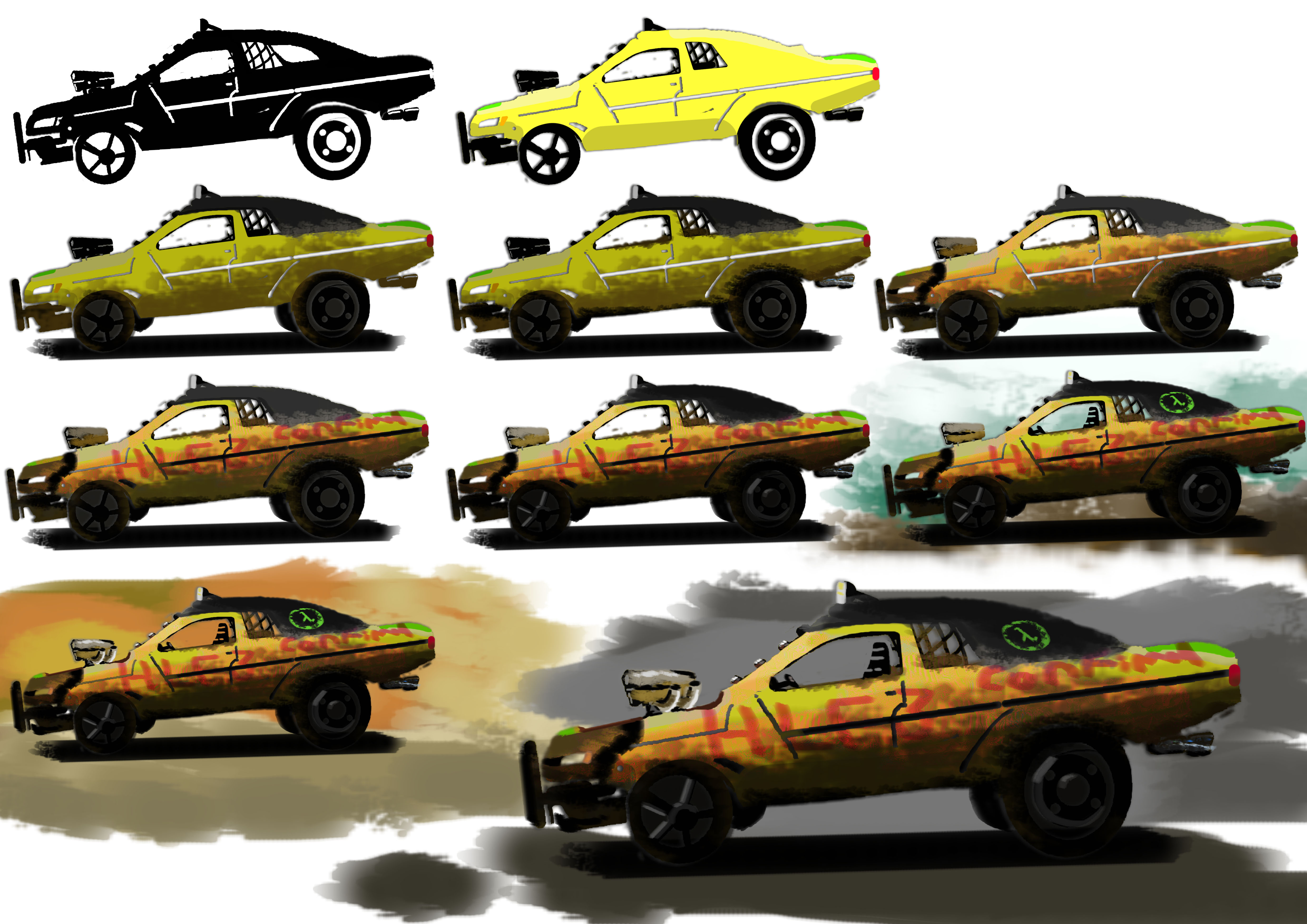 I started with a set of silhouette thumbnails to define the shape of the car after doing some photomanipulation and merging two car bodies together. I then applied colour and layered the detail up. I was going for a semi rusted look with the front end being completely different to the back. As if it was welded together. Speaking of colour the painted words stand for HLF3 Confirmed.